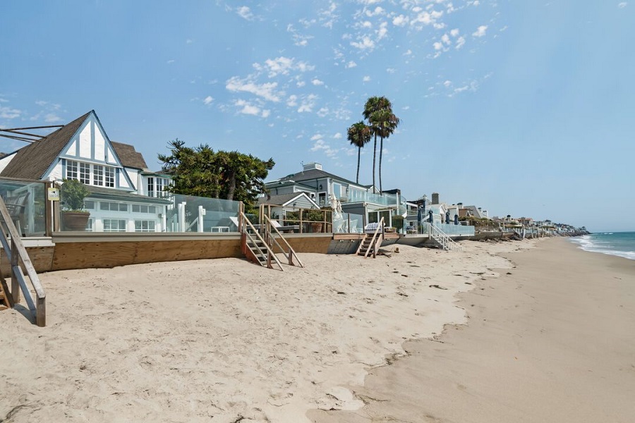 Despite occupying less than a quarter-acre parcel, the home offers multiple outdoor deck spaces and direct beach access. The backyard includes a raised deck with stairs leading to Malibu Beach, with approximately 37.5 feet of ocean frontage along one of the sandiest stretches of Malibu Colony. Monthly homeowners’ association dues are about $800.