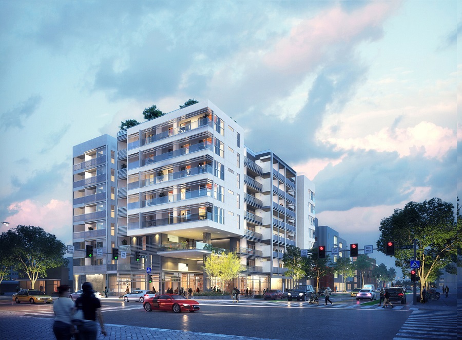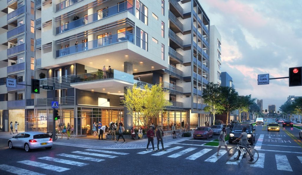 The eight-story building at 501 Broadway features a rooftop deck and 18 deed-restricted affordable units.